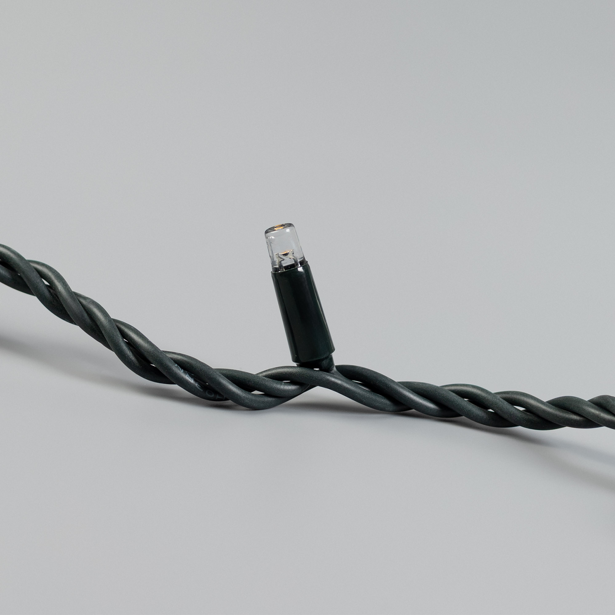 Светодиодная нить Pro. Размер 10000 мм. Цвет свечения ТЕПЛЫЙ БЕЛЫЙ (3000 К). 100 светодиодов размером 7 мм со статическим эффектом свечения с резким световым рисунком (прозрачная вогнутая линза). Провод темно-зеленый, каучук. Питание 230 В, Мощность 7 Вт, защита IP65, применение в помещении и на улице под навесом. Аксессуары для подключения и управления приобретаются отдельно.