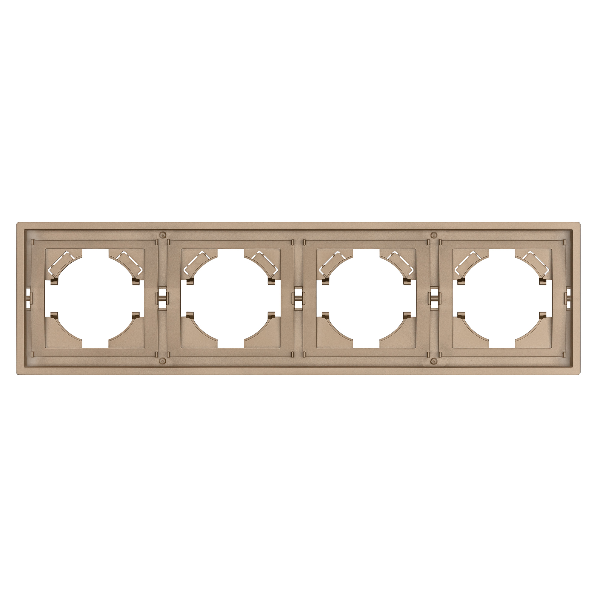 Рамка пластиковая на 4 поста, под встраиваемый механизм. Цвет - золотой. Среднего уровня герметичности IP20. Ориентация монтажа горизонтальная. Габаритные размеры: длина 294 мм, ширина 80 мм, высота 9 мм. Гарантийный срок 12 мес.