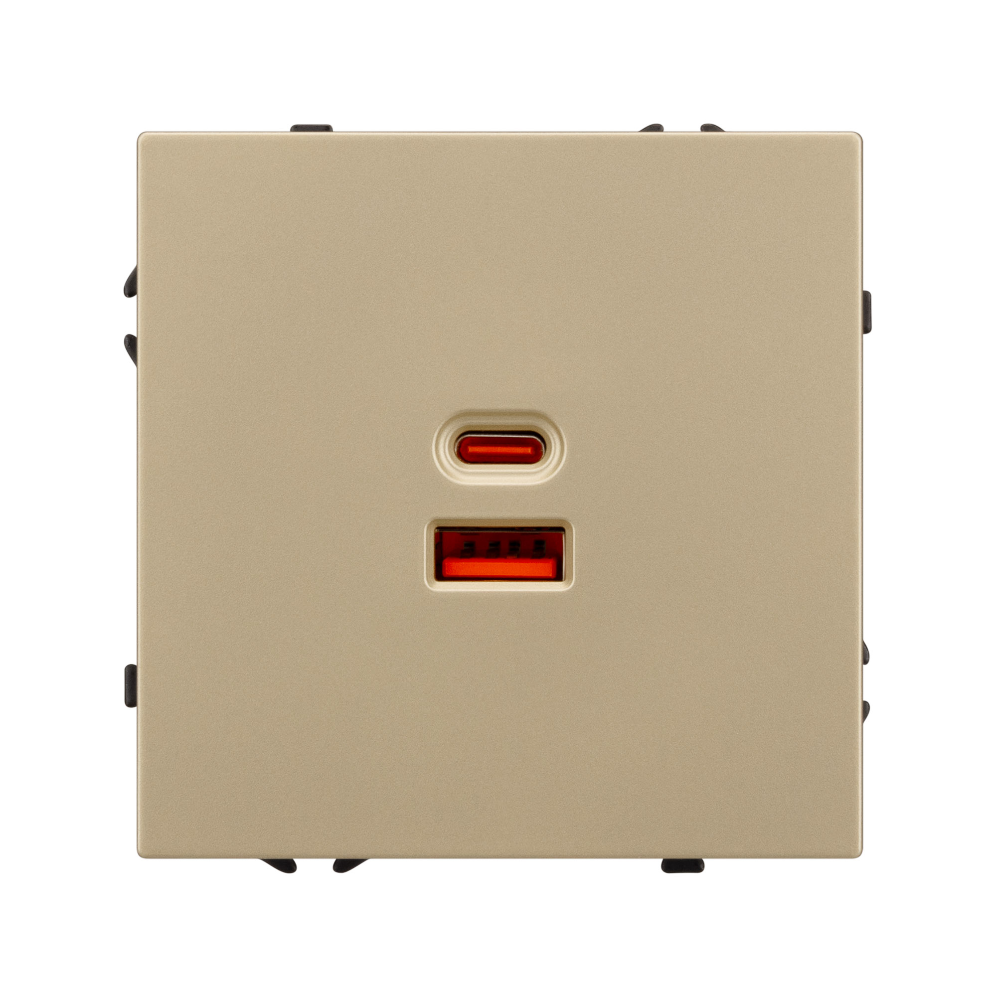 Строгие геометрические линии гармонично сочетаются с функциональностью продуманных механизмов, создавая идеальное решение для дизайн-проектов, где важны как эстетика, так и практичность. Механизм розетки с быстрой USB зарядкой, совместимый с рамками серии NOBE, создает утонченный минималистичный вид. Наличие USB Type A и Type C портов позволяет существенно сократить количество используемых розеточных постов под евровилку, сохраняя единую стилистику интерьера всего современного дизайн-проекта. Оба разъема поддерживают протокол быстрой зарядки Quick Charge QC 3.0, помимо этого для разъема Type C доступен протокол Power Delivery*. Выходные параметры для данных типов портов при этом составляют 30W и 65W соответственно. Видимая часть механизма выполнена из высококачественного пластика цвета золотой песок и имеет Soft-Touch покрытие, что придает изделию приятные тактильные ощущения и стильный внешний вид. Контактная часть присоединяется при помощи винтовых зажимов, позволяя надежно подсоединить механизм выключателя к питающим элементам. Суппорт окрашен в черный матовый цвет под основу механизма и выполнен из металла толщиной 1,5мм, что обеспечивает безопасность и уверенность в установке. На каждой стороне суппорта размещены фиксирующие элементы, позволяющие комбинировать механизмы в системы до 5шт как горизонтально, так и вертикально. *Для активации функции быстрой зарядки необходимо использовать специализированный зарядный кабель, который предназначен для работы с зарядными устройствами повышенной мощности.