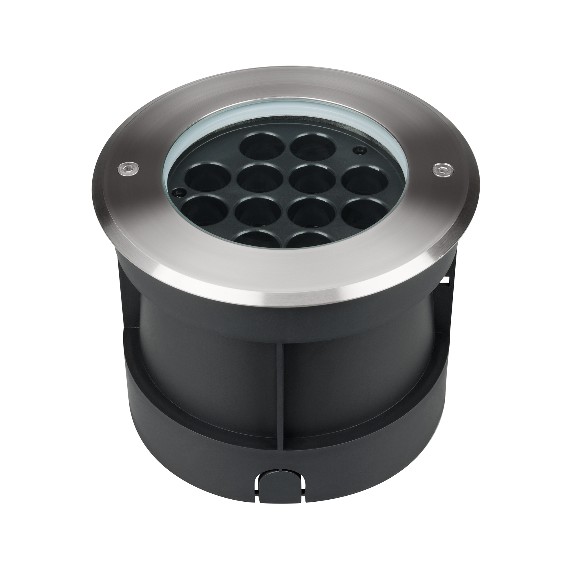 Встраиваемый светодиодный светильник для грунта и пола. Мощность 25 Вт, световой поток 2217 лм, цвет дневной 4000К. CRI(Ra)>80, угол 45°. Круглый влагозащищенный корпус IP67, нержавеющая сталь. Экран закалённое стекло. Питание 230В, 25Вт. Размер DxH Ø180x140мм. Установка в отверстие DxH Ø166x137мм.