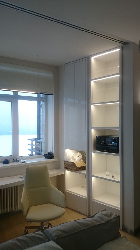 Подсветка полок шкафа - одновременно декоративная и функциональная. Она способна выделить отдельные предметы, например, сувениры, стоящие на полках, световым акцентом. И в то же время она поможет быстрее найти нужный предмет, ведь обычно света в глубине полок недостаточно.