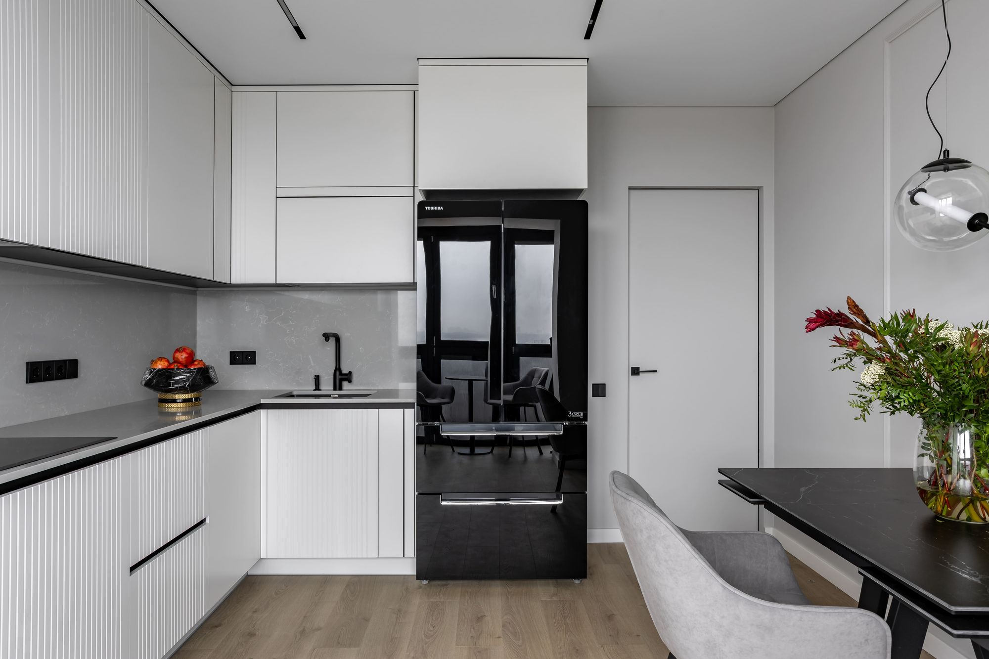 В дизайне кухни концепция минимализма достигла своего пика. Для основного освещения используются магнитные треки ORIENT и светильники FLAT. Тонкая линия трека, встроенного в потолок, дополняет аналогичный паттерн на мебели. Гармоническое сочетание вертикальных и горизонтальных темных линий на белом фоне усиливается, когда вспыхивает свет утопленных в черный трек светильников.
