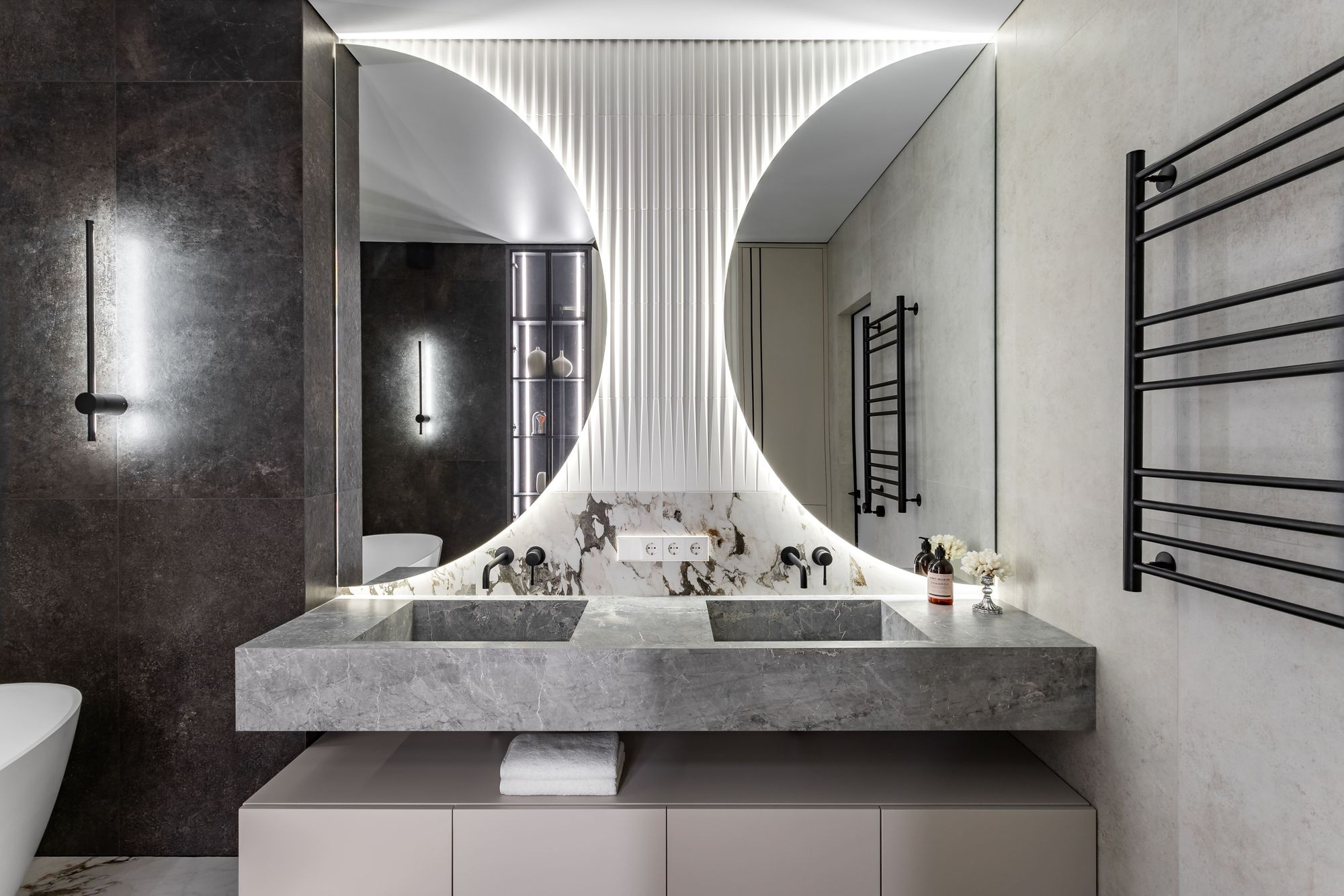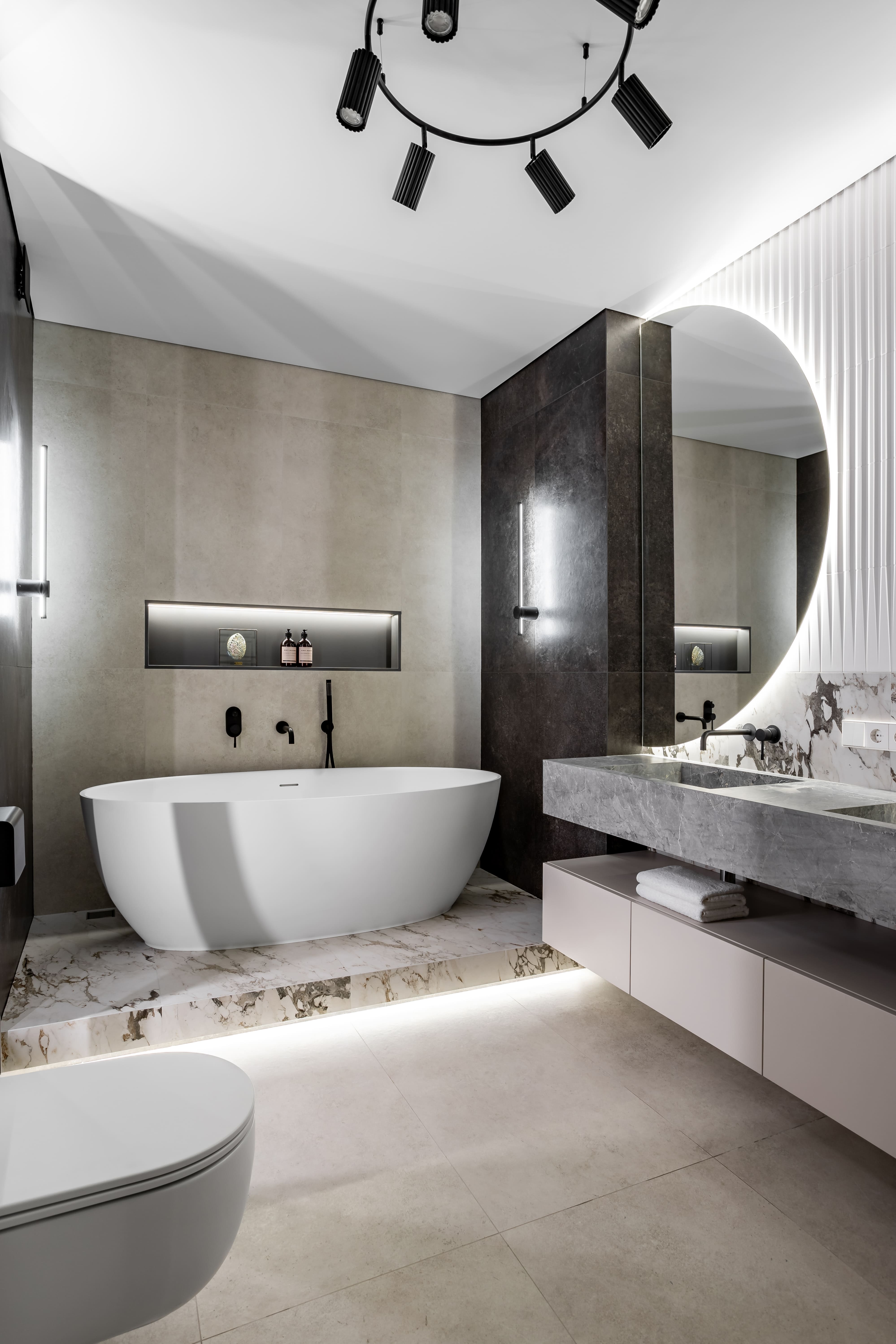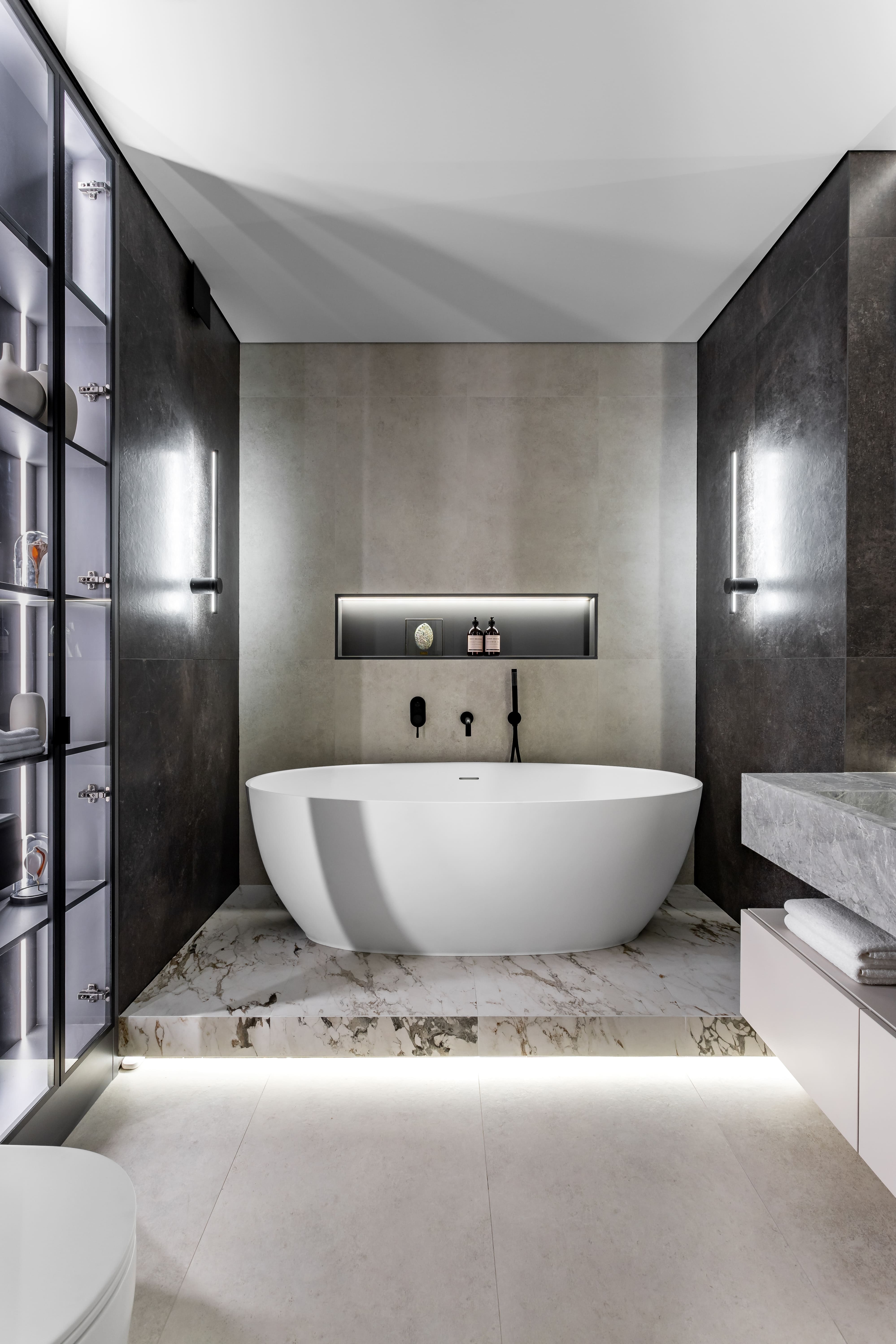 Герметичная лента RTW используется в ванной: оригинальные полукруглые зеркала, а также подиум и ниши подсвечены дневным белым светом, делая пространство ванной светлым, удобным и безопасным.