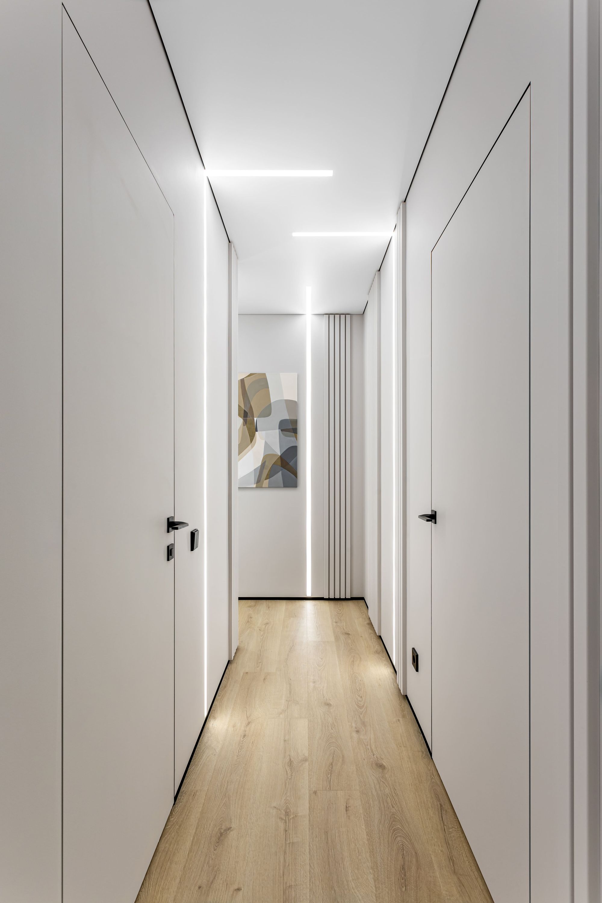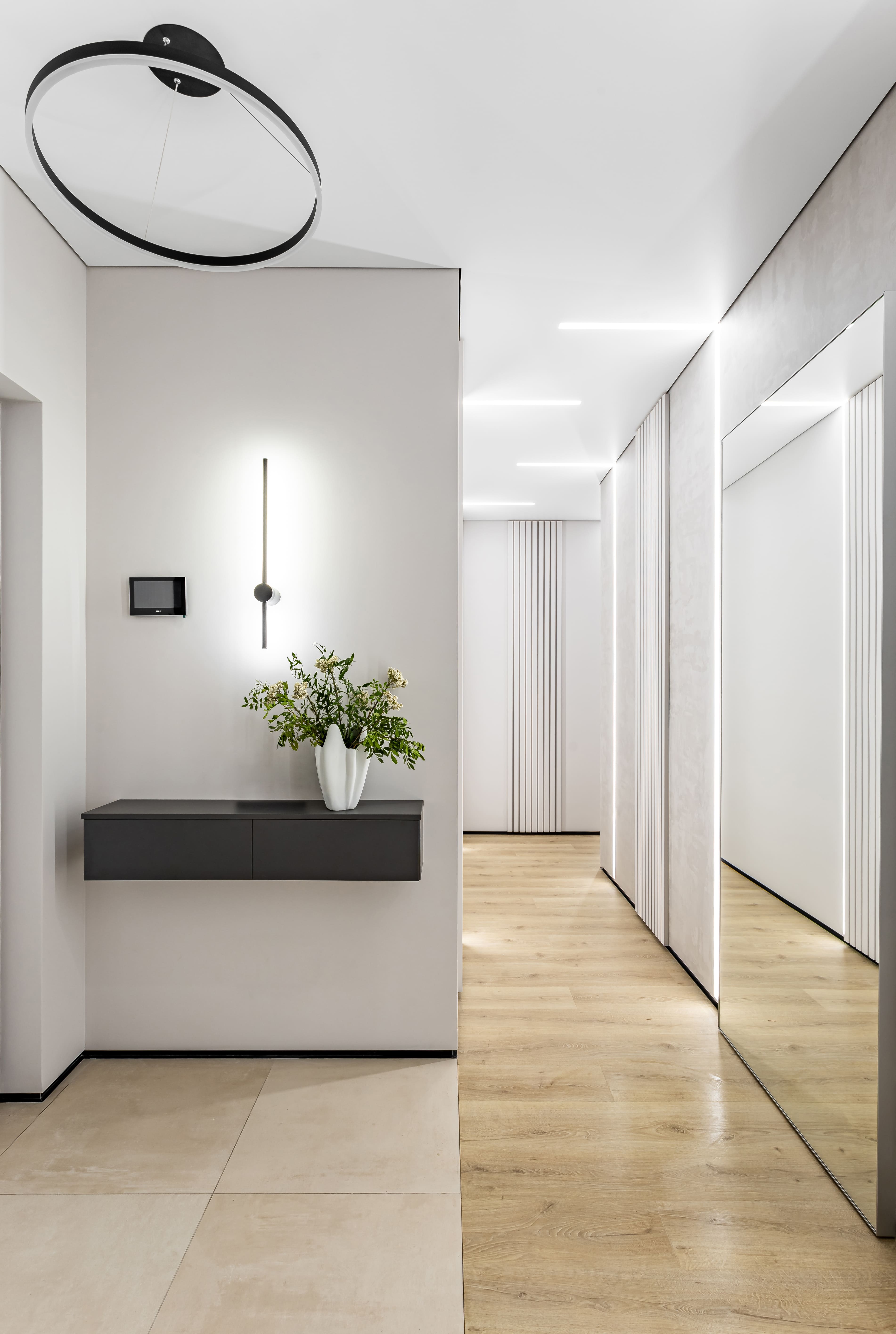 В интерьере очень много световых линий на основе светодиодных лент RT, RTW и UL в сочетании с профилями SL и LINE. В ванной линии света пронизывают задние поверхности прозрачных стеклянных шкафов, что обеспечивает одновременно футуристическую и комфортную атмосферу. В коридоре световые линии рифмуются с реечным декором стен, работая на ощущение светлого, легкого, вытянутого по вертикали пространства. Переходя со стен на потолок, они создают оригинальные Г-образные формы.