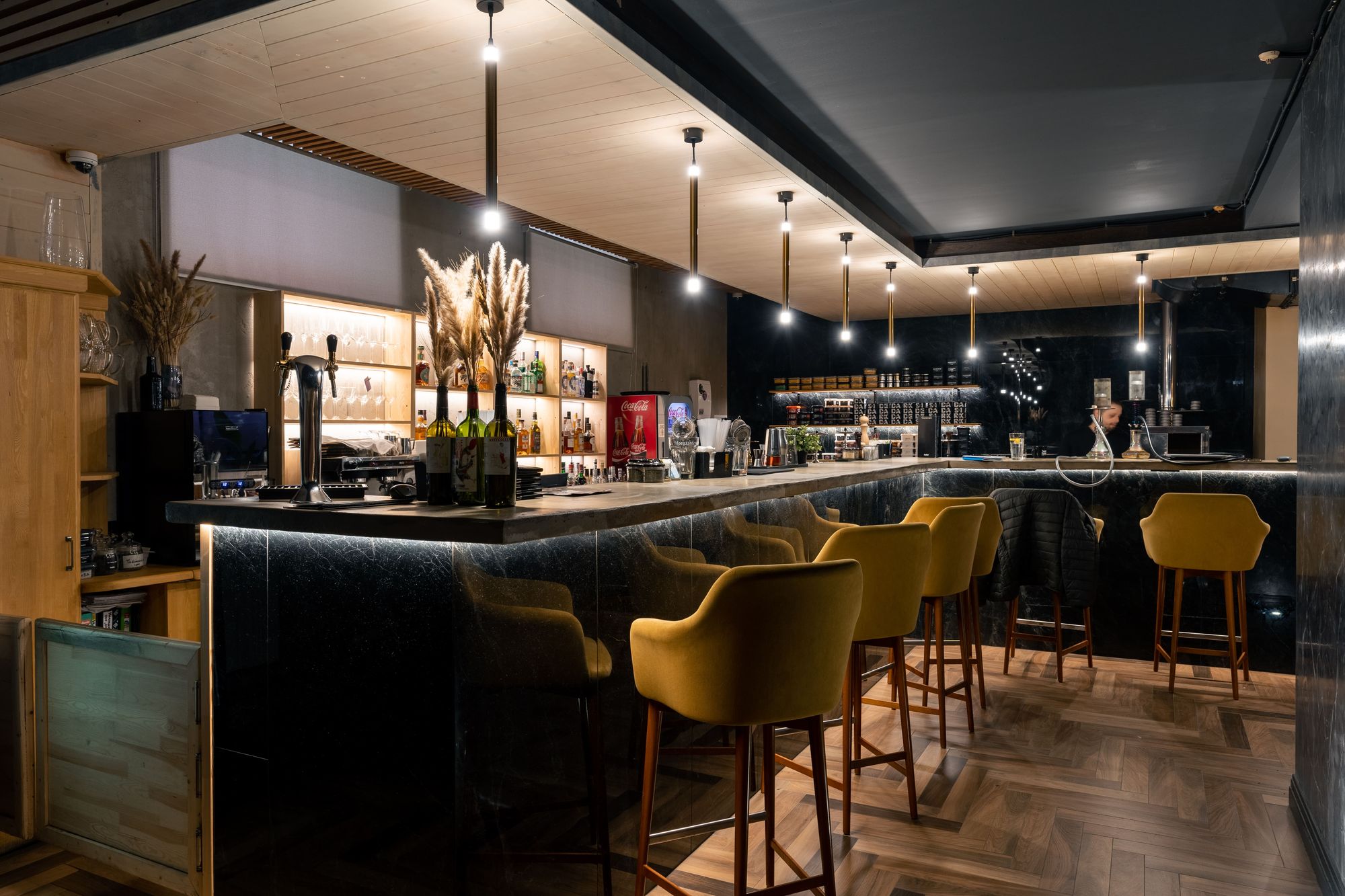 В проекте также предусмотрено расширенное управление освещением. Специальный контроллер управляет цветом свечения RGBW-лент, что позволяет мгновенно изменять атмосферу в баре.