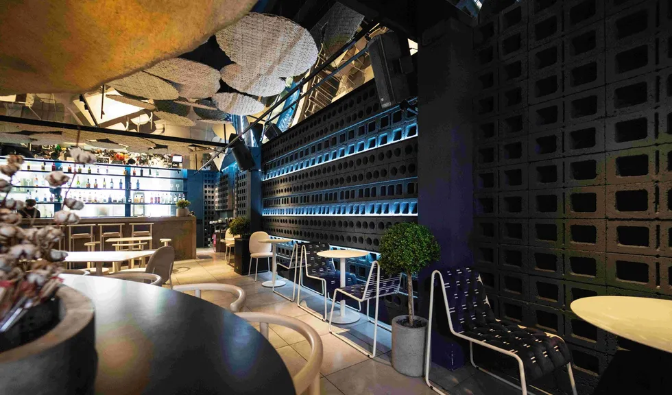 Нашлось место и для других креативных решений. Так, дизайнеры подсветили инсталляцию из… прессованных яичных сот на потолке. А символы, обозначающие санузел, выделяет игра света и тени.