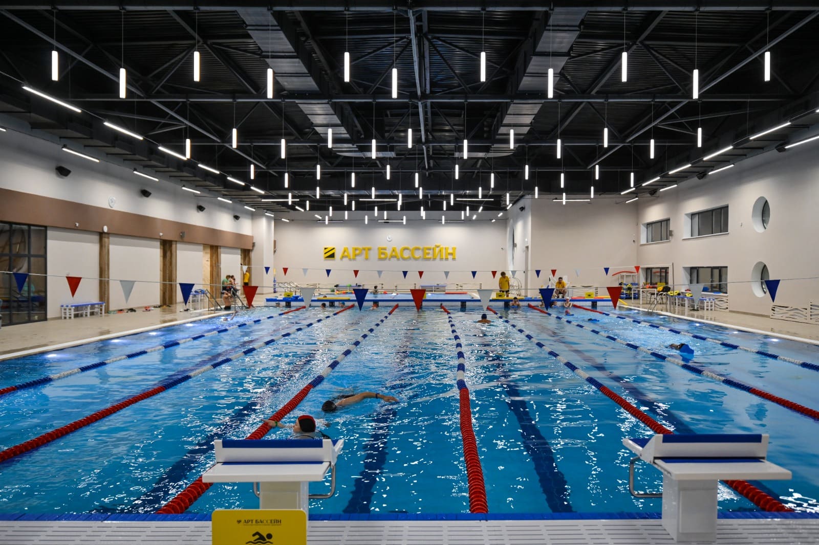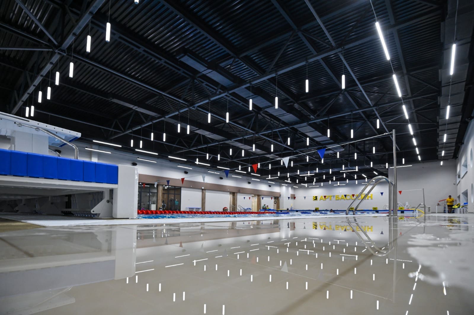 Чтобы гармонично вписаться в интерьер и не перегрузить спортивный комплекс «Арт Бассейн» строгой геометрией, были подобраны соответствующие источники освещения.