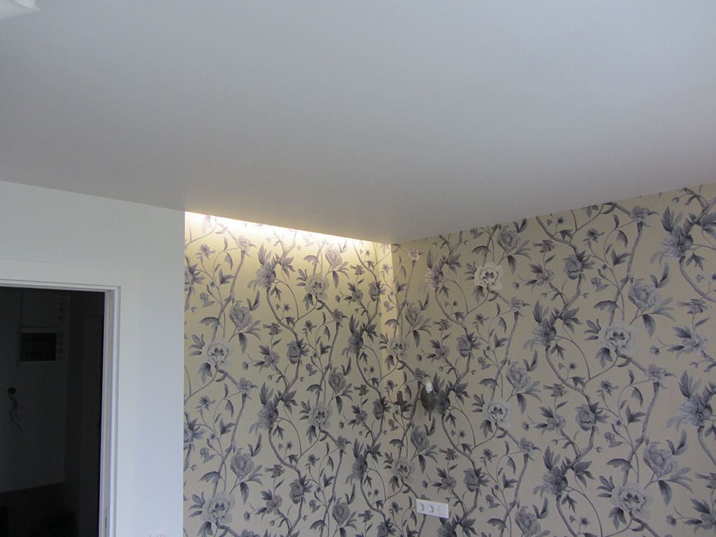 Важно отметить, что для равномерного свечения без засветок и полос, светодиодная лента должна быть установлена с равными, правильно рассчитанными промежутками. Для данного проекта количество светодиодных лент, промежутки между ними были рассчитаны заранее, в соответствии с площадью засветки. Проводка находится на одном уровне с лентой и не имеет провисающих участков, способных отбрасывать тень, которая будет видна на поверхности натяжного потолка.